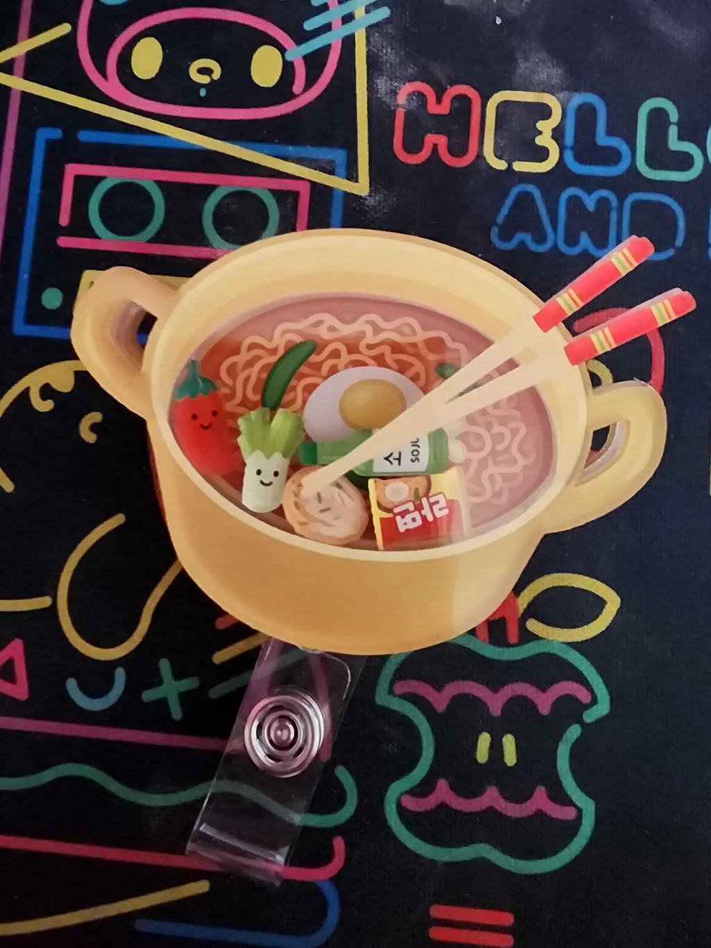 Ramen shaker badge reel inspired by Korean food. Cute noodle pot ID holder for nurses, teachers & food lovers — retractable & fun!