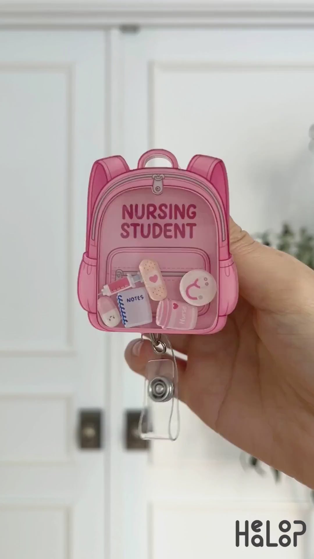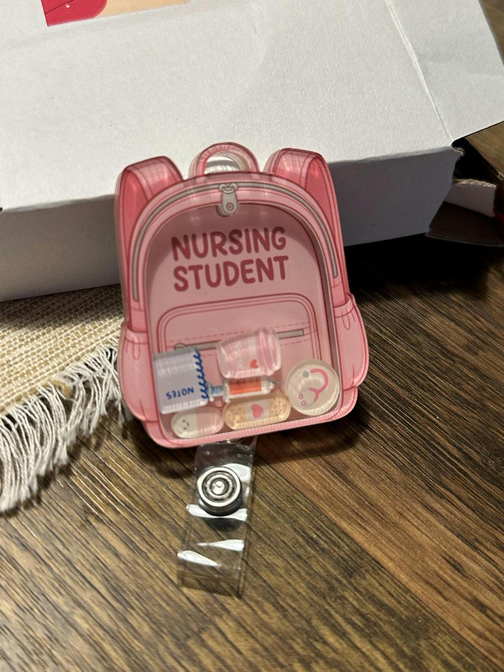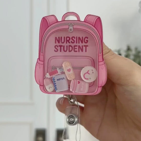 Adorable nursing student shaker badge reel shaped like a pink backpack with school-themed charms. A fun and practical ID holder for future nurses.