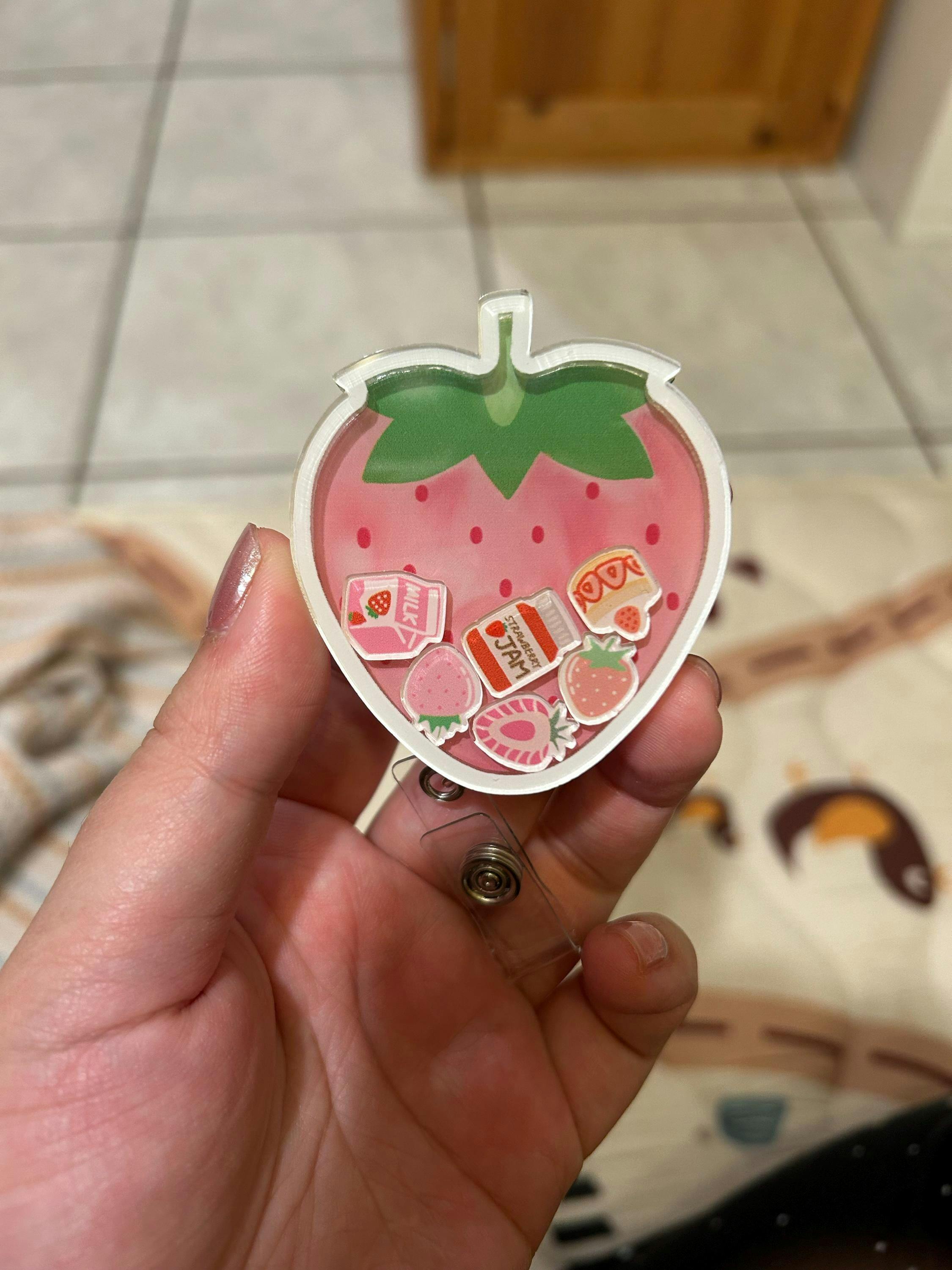 Cute Strawberry Shaker Badge Reel with floating charms. Retractable nurse ID holder – a fun summer badge reel and kawaii nursing gift.
